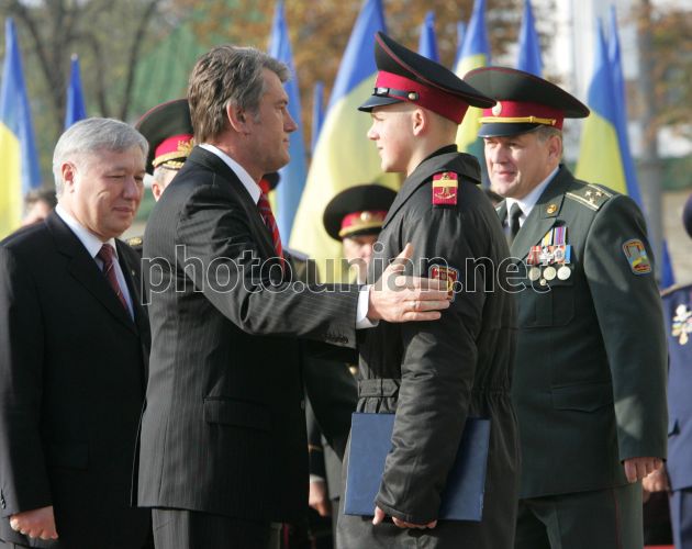 Президент Украины Виктор Ющенко, слева, здоровается с курсантами во время церемонии возложения цветов к памятнику Богдану Хмельницкому по случаю празднования Дня украинского казачества и праздника Покровы Пресвятой Богородицы и Приснодевы Марии в Киеве, во вторник, 14 октября 2008 г. Фото Михаила Маркива / POOL / УНИАН