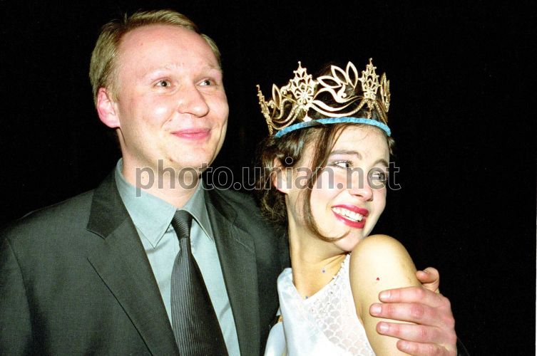 Победительница конкурса красоты "Мисс Киев ХХ век" Анна Врублевская, 19 лет, вместе со своим другом Алексеем принимает поздравления во время церемонии награждения вечером во вторник, 29 февраля 2000г. в Национальной опере, Киев. Студентка 2-го курса экономического факультета Международного научно-технического университета и модель агентства "Карин" А. Врублевская уже завоевывала титул Студенческой королевы Киева в 1998г., и Приз зрительских симпатий на московском конкурсе "Мисс Революция" в 1999г.