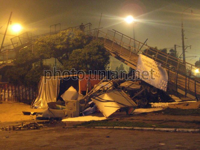 Обломки рухнувшего пешеходного моста в Мариуполе, в четверг, 16 октября 2008 г. В этот день около 22 часов ночи в Приморском районе Мариуполя рухнул пешеходный мост. Его сбил груженный зерном КАМАЗ с прицепом, который вез урожай пшеницы на элеватор в порт. По словам водителя, у грузовика отказали тормоза, когда он спускался вниз по улице Гагарина. На пересечении улицы Гагарина и проспекта Адмирала Лунина, грузовик остановили железобетонные опоры пешеходного моста и кирпичный забор порта. КАМАЗ развалился на части. Пешеходный мост рухнул на проезжую часть дороги, придавив КАМАЗ, а второй конец упавшего моста раздавил газетный киоск, который находился на противоположной стороне проспекта. Водителя грузовика, зажатого в кабине, помогли освободить местные жители, разобрав кабину и отвинтив ключами руль. Фото УНИАН