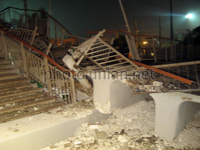 Обломки рухнувшего пешеходного моста в Мариуполе, в четверг, 16 октября 2008 г. В этот день около 22 часов ночи в Приморском районе Мариуполя рухнул пешеходный мост. Его сбил груженный зерном КАМАЗ с прицепом, который вез урожай пшеницы на элеватор в порт. По словам водителя, у грузовика отказали тормоза, когда он спускался вниз по улице Гагарина. На пересечении улицы Гагарина и проспекта Адмирала Лунина, грузовик остановили железобетонные опоры пешеходного моста и кирпичный забор порта. КАМАЗ развалился на части. Пешеходный мост рухнул на проезжую часть дороги, придавив КАМАЗ, а второй конец упавшего моста раздавил газетный киоск, который находился на противоположной стороне проспекта. Водителя грузовика, зажатого в кабине, помогли освободить местные жители, разобрав кабину и отвинтив ключами руль. Фото УНИАН