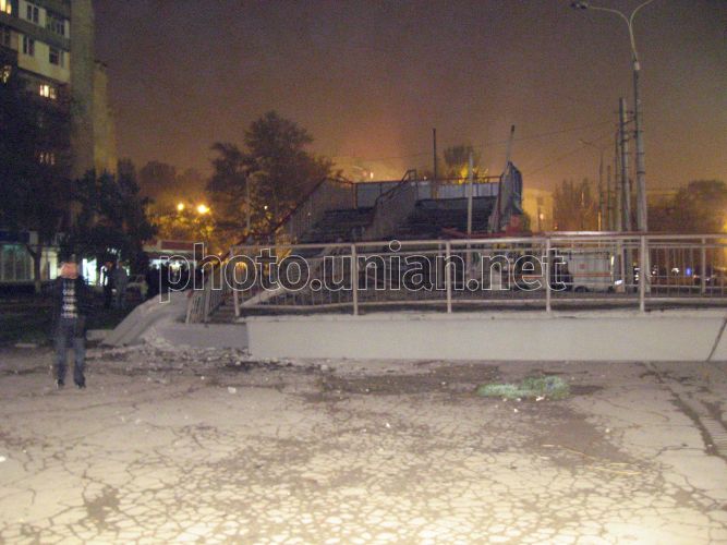 Обломки рухнувшего пешеходного моста в Мариуполе, в четверг, 16 октября 2008 г. В этот день около 22 часов ночи в Приморском районе Мариуполя рухнул пешеходный мост. Его сбил груженный зерном КАМАЗ с прицепом, который вез урожай пшеницы на элеватор в порт. По словам водителя, у грузовика отказали тормоза, когда он спускался вниз по улице Гагарина. На пересечении улицы Гагарина и проспекта Адмирала Лунина, грузовик остановили железобетонные опоры пешеходного моста и кирпичный забор порта. КАМАЗ развалился на части. Пешеходный мост рухнул на проезжую часть дороги, придавив КАМАЗ, а второй конец упавшего моста раздавил газетный киоск, который находился на противоположной стороне проспекта. Водителя грузовика, зажатого в кабине, помогли освободить местные жители, разобрав кабину и отвинтив ключами руль. Фото УНИАН