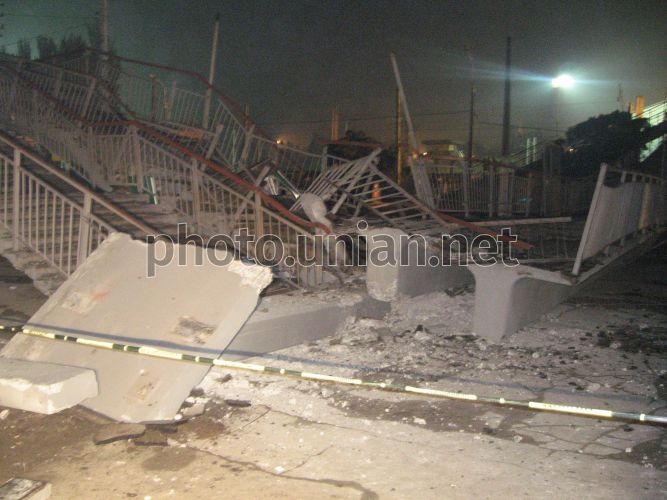 Обломки рухнувшего пешеходного моста в Мариуполе, в четверг, 16 октября 2008 г. В этот день около 22 часов ночи в Приморском районе Мариуполя рухнул пешеходный мост. Его сбил груженный зерном КАМАЗ с прицепом, который вез урожай пшеницы на элеватор в порт. По словам водителя, у грузовика отказали тормоза, когда он спускался вниз по улице Гагарина. На пересечении улицы Гагарина и проспекта Адмирала Лунина, грузовик остановили железобетонные опоры пешеходного моста и кирпичный забор порта. КАМАЗ развалился на части. Пешеходный мост рухнул на проезжую часть дороги, придавив КАМАЗ, а второй конец упавшего моста раздавил газетный киоск, который находился на противоположной стороне проспекта. Водителя грузовика, зажатого в кабине, помогли освободить местные жители, разобрав кабину и отвинтив ключами руль. Фото УНИАН