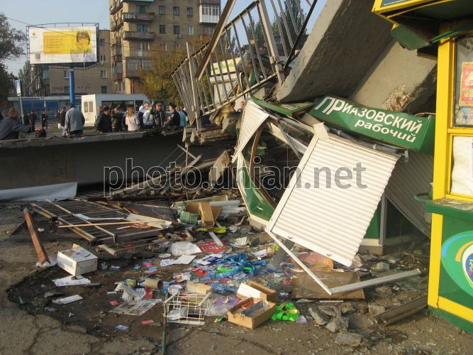 Обломки рухнувшего пешеходного моста и газетного киоска в Мариуполе, в пятницу, 17 октября 2008 г. В четверг, 16 октября, около 22 часов ночи в Приморском районе Мариуполя рухнул пешеходный мост. Его сбил груженный зерном КАМАЗ с прицепом, который вез урожай пшеницы на элеватор в порт. По словам водителя, у грузовика отказали тормоза, когда он спускался вниз по улице Гагарина. На пересечении улицы Гагарина и проспекта Адмирала Лунина, грузовик остановили железобетонные опоры пешеходного моста и кирпичный забор порта. КАМАЗ развалился на части. Пешеходный мост рухнул на проезжую часть дороги, придавив КАМАЗ, а второй конец упавшего моста раздавил газетный киоск, который находился на противоположной стороне проспекта. Водителя грузовика, зажатого в кабине, помогли освободить местные жители, разобрав кабину и отвинтив ключами руль. Фото УНИАН