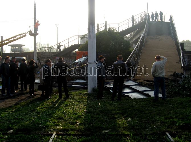 Люди смотрят на обломки рухнувшего пешеходного моста в Мариуполе, в пятницу, 17 октября 2008 г. В четверг, 16 октября, около 22 часов ночи в Приморском районе Мариуполя рухнул пешеходный мост. Его сбил груженный зерном КАМАЗ с прицепом, который вез урожай пшеницы на элеватор в порт. По словам водителя, у грузовика отказали тормоза, когда он спускался вниз по улице Гагарина. На пересечении улицы Гагарина и проспекта Адмирала Лунина, грузовик остановили железобетонные опоры пешеходного моста и кирпичный забор порта. КАМАЗ развалился на части. Пешеходный мост рухнул на проезжую часть дороги, придавив КАМАЗ, а второй конец упавшего моста раздавил газетный киоск, который находился на противоположной стороне проспекта. Водителя грузовика, зажатого в кабине, помогли освободить местные жители, разобрав кабину и отвинтив ключами руль. Фото УНИАН