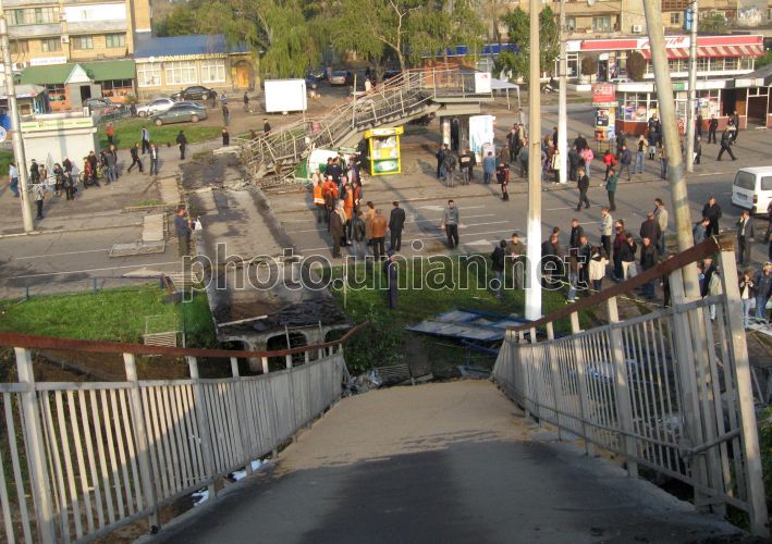 Люди смотрят на обломки рухнувшего пешеходного моста в Мариуполе, в пятницу, 17 октября 2008 г. В четверг, 16 октября, около 22 часов ночи в Приморском районе Мариуполя рухнул пешеходный мост. Его сбил груженный зерном КАМАЗ с прицепом, который вез урожай пшеницы на элеватор в порт. По словам водителя, у грузовика отказали тормоза, когда он спускался вниз по улице Гагарина. На пересечении улицы Гагарина и проспекта Адмирала Лунина, грузовик остановили железобетонные опоры пешеходного моста и кирпичный забор порта. КАМАЗ развалился на части. Пешеходный мост рухнул на проезжую часть дороги, придавив КАМАЗ, а второй конец упавшего моста раздавил газетный киоск, который находился на противоположной стороне проспекта. Водителя грузовика, зажатого в кабине, помогли освободить местные жители, разобрав кабину и отвинтив ключами руль. Фото УНИАН
