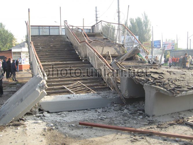 Обломки рухнувшего пешеходного моста в Мариуполе, в пятницу, 17 октября 2008 г. В четверг, 16 октября, около 22 часов ночи в Приморском районе Мариуполя рухнул пешеходный мост. Его сбил груженный зерном КАМАЗ с прицепом, который вез урожай пшеницы на элеватор в порт. По словам водителя, у грузовика отказали тормоза, когда он спускался вниз по улице Гагарина. На пересечении улицы Гагарина и проспекта Адмирала Лунина, грузовик остановили железобетонные опоры пешеходного моста и кирпичный забор порта. КАМАЗ развалился на части. Пешеходный мост рухнул на проезжую часть дороги, придавив КАМАЗ, а второй конец упавшего моста раздавил газетный киоск, который находился на противоположной стороне проспекта. Водителя грузовика, зажатого в кабине, помогли освободить местные жители, разобрав кабину и отвинтив ключами руль. Фото УНИАН
