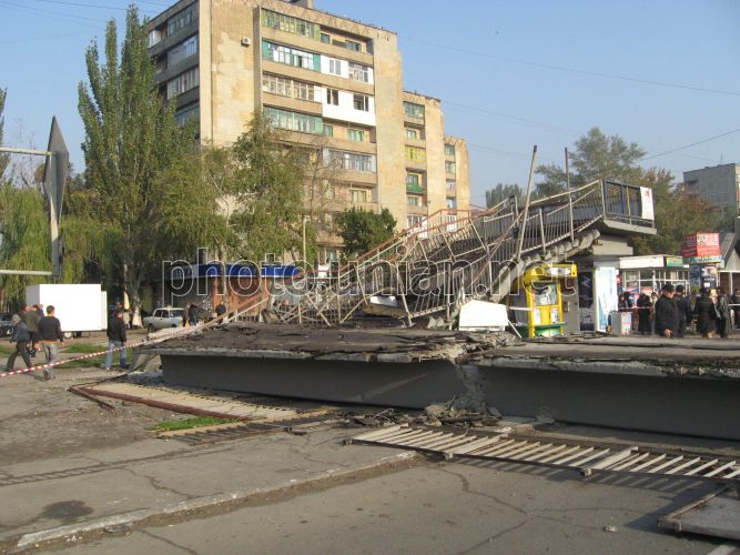 Обломки рухнувшего пешеходного моста в Мариуполе, в пятницу, 17 октября 2008 г. В четверг, 16 октября, около 22 часов ночи в Приморском районе Мариуполя рухнул пешеходный мост. Его сбил груженный зерном КАМАЗ с прицепом, который вез урожай пшеницы на элеватор в порт. По словам водителя, у грузовика отказали тормоза, когда он спускался вниз по улице Гагарина. На пересечении улицы Гагарина и проспекта Адмирала Лунина, грузовик остановили железобетонные опоры пешеходного моста и кирпичный забор порта. КАМАЗ развалился на части. Пешеходный мост рухнул на проезжую часть дороги, придавив КАМАЗ, а второй конец упавшего моста раздавил газетный киоск, который находился на противоположной стороне проспекта. Водителя грузовика, зажатого в кабине, помогли освободить местные жители, разобрав кабину и отвинтив ключами руль. Фото УНИАН