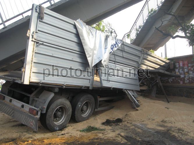 КАМАЗ, который сбил пешеходный мост в Мариуполе, в пятницу, 17 октября 2008 г. В четверг, 16 октября, около 22 часов ночи в Приморском районе Мариуполя рухнул пешеходный мост. Его сбил груженный зерном КАМАЗ с прицепом, который вез урожай пшеницы на элеватор в порт. По словам водителя, у грузовика отказали тормоза, когда он спускался вниз по улице Гагарина. На пересечении улицы Гагарина и проспекта Адмирала Лунина, грузовик остановили железобетонные опоры пешеходного моста и кирпичный забор порта. КАМАЗ развалился на части. Пешеходный мост рухнул на проезжую часть дороги, придавив КАМАЗ, а второй конец упавшего моста раздавил газетный киоск, который находился на противоположной стороне проспекта. Водителя грузовика, зажатого в кабине, помогли освободить местные жители, разобрав кабину и отвинтив ключами руль. Фото УНИАН