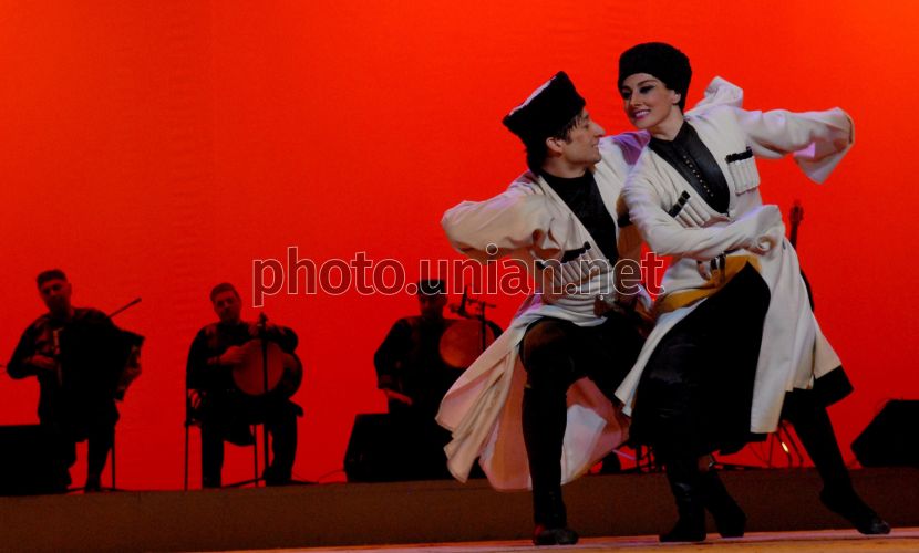 Участники Национального балета Грузии “Сухишвили” во время выступления, в Києве, в понедельник, 10 ноября 2008 г. Национальный балет Грузии был основан Илико Сухишвили и Нино Рамишвили в 1945 г. Коллектив состоит из 70 танцоров и собственного оркестра. В репертуаре тбилисского коллектива древние и современные танцы Кавказа. Традиционно концерты начинаются танцем воинов Хоруми. Среди известных народных танцев - современные интерпретации Самане - танца амазонок, Кинтоури - танец городских торговцев, горный танец с саблями - Хевсурули, женский Самая - танец трех граций, свадебный танец - Симди, Ханджлури - танец с кинжалами, Илоури, Джута, Лазури, Сванури и др. Фото УНИАН