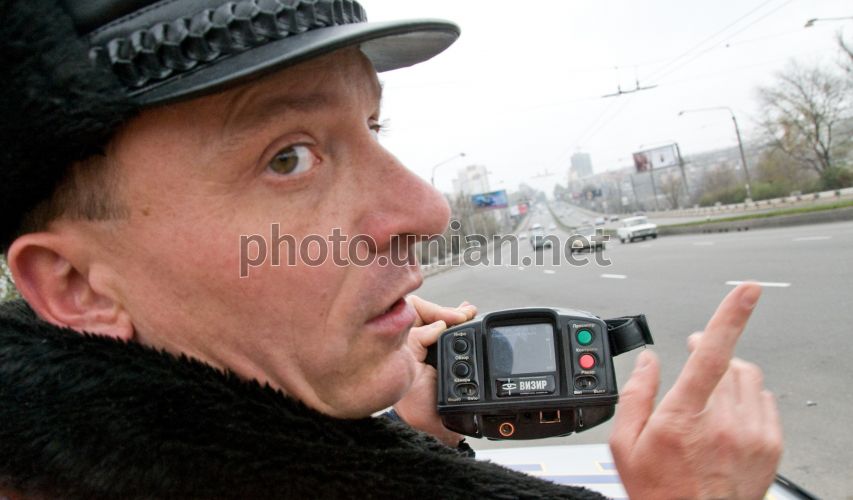 Сотрудник ГАИ держит в руках видеозаписывающий измеритель скорости «Визир», в Запорожье, в понедельник, 17 ноября 2008 г. Прибор не только измеряет скорость движущихся транспортных средств, но и позволяет делать фото и видео запись нарушителей, что является неоспоримым доказательством при решении конфликтных ситуаций. Радар позволяет измерять скорость в стационарном и патрульном режиме на расстоянии не менее 400 м. «Визир» может работать в двух режимах: контроль с измерением скорости и контроль без измерения скорости. В первом случае, с помощью функции «Радар», инспектором задается порог скорости. Если измеренная скорость больше установленного порога, прибор сделает снимок одного кадра или начнет видеозапись. Прибор обеспечивает внесение в кадр информацию о дате, времени и скорости транспортного средства. Во втором случае, прибор может быть использован как фотоаппарат или видеокамера, например для фотографирования места ДТП. Сделанные кадры хранятся в энергонезависимом архиве. Стоимость прибора составляет около 17 тысяч гривен. Фото Александра Прилепы / УНИАН