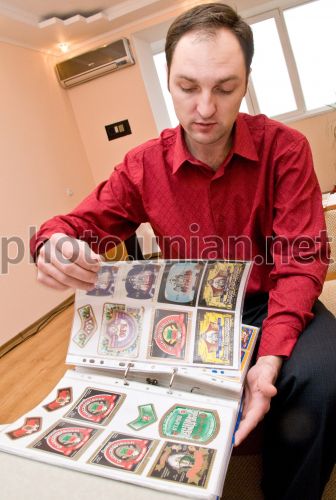 FILE Коллекционер пивных наклеек Алексей Ипатов показывает свою коллекцию, в Запорожье, в воскресенье, 30 ноября 2008 г. Алексей Ипатов собрал более 40 тысяч этикеток от пива из разных стран мира. Среди них 1200 этикеток запорожских пивоваров. Фото Александра Прилепы / УНИАН