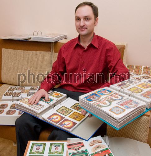FILE Коллекционер пивных наклеек Алексей Ипатов показывает свою коллекцию, в Запорожье, в воскресенье, 30 ноября 2008 г. Алексей Ипатов собрал более 40 тысяч этикеток от пива из разных стран мира. Среди них 1200 этикеток запорожских пивоваров. Фото Александра Прилепы / УНИАН