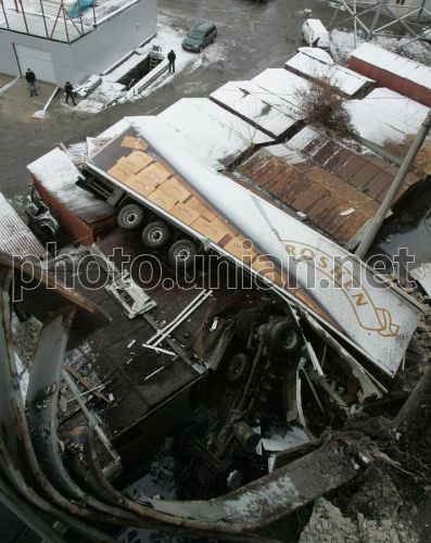 Грузовик, лежащий на гаражах, под Южным Мостом, в Киеве, во вторник, 9 декабря 2008 г. В этот день, около 8 утра, на Южном мосту произошло ДТП. Груженный конфетами грузовик марки ”Рено”, который двигался в сторону Харьковского массива, сбил ограждение моста и упал вниз на расположенные под ним гаражи. От удара водитель фуры оказался зажатым в кабине. Почти четыре часа длилась операция по освобождению пострадавшего. Спасатели подогнали кран и с его помощью приподняли искореженную кабину грузовика. А потом с помощью пневматического расширителя достали человека. Фото Владимира Гонтара / УНИАН
