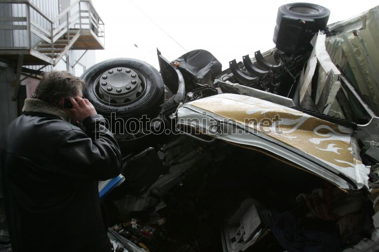 Грузовик, лежащий на гаражах, под Южным Мостом, в Киеве, во вторник, 9 декабря 2008 г. В этот день, около 8 утра, на Южном мосту произошло ДТП. Груженный конфетами грузовик марки ”Рено”, который двигался в сторону Харьковского массива, сбил ограждение моста и упал вниз на расположенные под ним гаражи. От удара водитель фуры оказался зажатым в кабине. Почти четыре часа длилась операция по освобождению пострадавшего. Спасатели подогнали кран и с его помощью приподняли искореженную кабину грузовика. А потом с помощью пневматического расширителя достали человека. Фото Владимира Гонтара / УНИАН