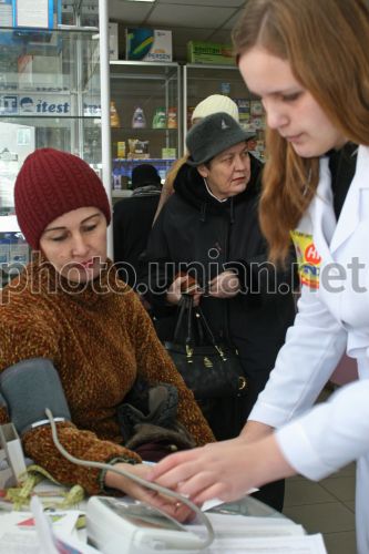Студентка первого курса медицинского училища измеряет женщине артериальное давление в одной из аптек Донецка во время акции ”Измеряй свое давление – скажи инсульту – НЕТ!”, в среду, 17 декабря 2008 г. В этот день в Донецке в рамках Всемирного Дня борьбы с инсультом прошла акция ”Измеряй свое давление – скажи инсульту – НЕТ!”. Давление измеряли бесплатно в помещениях областного, городского и районных исполкомах, института восстановительной хирургии, областном и городском центрах занятости, аптеках и в крупных торговых центрах города. Целью акции являлось привлечение молодого поколения к здоровому образу жизни, пропаганда против вредных привычек, а также привлечение внимания жителей области к проблемам высокого артериального давления как одного из факторов возникновения осложнения сердечно-сосудистых заболеваний, в частности – инсульта. Фото УНИАН