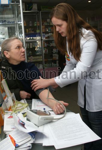 Студентка первого курса медицинского училища измеряет женщине артериальное давление в одной из аптек Донецка во время акции ”Измеряй свое давление – скажи инсульту – НЕТ!”, в среду, 17 декабря 2008 г. В этот день в Донецке в рамках Всемирного Дня борьбы с инсультом прошла акция ”Измеряй свое давление – скажи инсульту – НЕТ!”. Давление измеряли бесплатно в помещениях областного, городского и районных исполкомах, института восстановительной хирургии, областном и городском центрах занятости, аптеках и в крупных торговых центрах города. Целью акции являлось привлечение молодого поколения к здоровому образу жизни, пропаганда против вредных привычек, а также привлечение внимания жителей области к проблемам высокого артериального давления как одного из факторов возникновения осложнения сердечно-сосудистых заболеваний, в частности – инсульта. Фото УНИАН