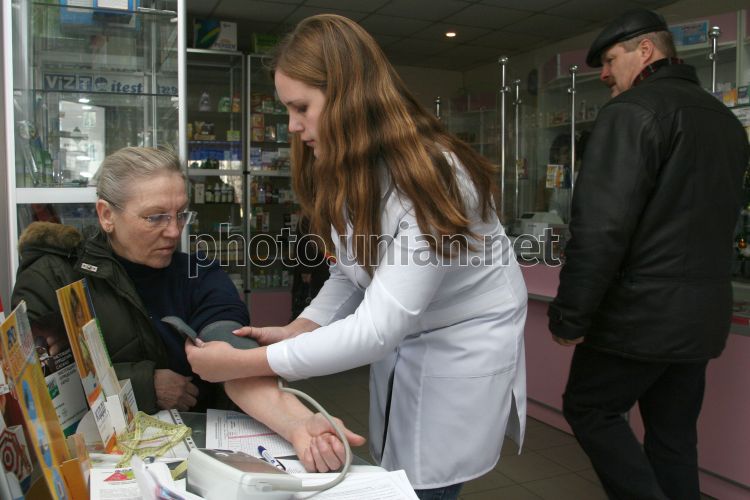 Студентка первого курса медицинского училища измеряет женщине артериальное давление в одной из аптек Донецка во время акции ”Измеряй свое давление – скажи инсульту – НЕТ!”, в среду, 17 декабря 2008 г. В этот день в Донецке в рамках Всемирного Дня борьбы с инсультом прошла акция ”Измеряй свое давление – скажи инсульту – НЕТ!”. Давление измеряли бесплатно в помещениях областного, городского и районных исполкомах, института восстановительной хирургии, областном и городском центрах занятости, аптеках и в крупных торговых центрах города. Целью акции являлось привлечение молодого поколения к здоровому образу жизни, пропаганда против вредных привычек, а также привлечение внимания жителей области к проблемам высокого артериального давления как одного из факторов возникновения осложнения сердечно-сосудистых заболеваний, в частности – инсульта. Фото УНИАН