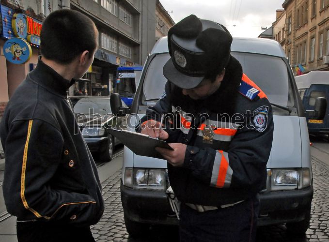 FILE Работник ГАИ составляет протокол о нарушении правил дорожного движения, во Львове, в понедельник, 17 ноября 2008 г. Сотрудники ГАИ на дорогах Украины на протяжении первого месяца действия новых штрафов собрали 34 миллиона гривен. Они уже оплатили в казначейство свыше 4 миллионов гривен. Не слишком придерживаются правил дорожного движения и владельцы автомобилей в Крыму, а также в Луганской, Одесской и Днепропетровской областях. Именно эти регионы, по данным Госказначейства, являются лидерами за поступлением в бюджет административных штрафов. Фото Виталия Грабара / УНИАН