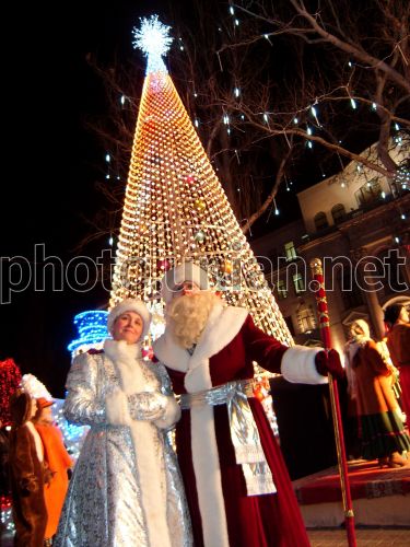 Дед Мороз со Снегурочкой возле елки, выполненной в стиле high-tek, в Днепропетровске, в понедельник, 22 декабря 2008 г. На площади между Днепропетровской областной государственной администрацией и областным советом впервые установлена 14-метровая ”губернаторская елка”, выполненная в стиле high-tek. Металлическую «губернаторскую елку» привезли из Австрии. Сама же техника отделки символического новогоднего дерева недавно была презентована на выставке новых технологий во Франкфурте (Германия). Вокруг «губернаторской елки» установлены большие фигуры лесных животных и снеговиков, которые светятся ночью. Деревья, растущие на площади между облгосадминистрацией и облсоветом, украшены новогодними «мерцающими огнями» и фонариками, которые создают эффект звездопада. Фото УНИАН