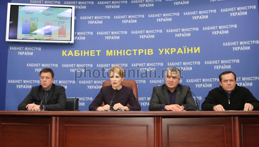 Премьер-министр Украины Юлия Тимошенко и председатель Всеукраинской ассоциации пекарей Владимир Слабовский, второй справа, на брифинге в Кабинете Министров, в Киеве, в среду, 24 декабря 2008 г. В ходе брифинга Премьер-министр Украины предложила срочно в этот день принять в Верховной Раде закон для сохранения пекарен. «Мы отработали экстренный законопроект об остановке кризисных явлений», - сказала Тимошенко. По ее словам, проект закона предусматривает три основных пункта: пролонгация кредитов хлебопекарням; перечисление валютных кредитов в гривневые по курсу 5,05 UAH/USD; обязательства НБУ рефинансировать банки, которые перечислят кредиты, под разрывы на три года с сохранением действующих требований к резервированию. «Мы будем настаивать, чтобы еще сегодня этот законопроект был проголосован в первом, втором чтении и в целом», - сказала премьер. Она также предложила представителям Ассоциации пекарей и профсоюзов пищевой и перерабатывающей промышленности, которые присутствовали вместе с ней на брифинге, требовать от Президента Украины подписать закон уже в этот день. «Если нет, то отсутствие хлеба на полках будет прямым фолом Президента», - подчеркнула Тимошенко. Фото Александра Прокопенко /POOL / УНИАН
