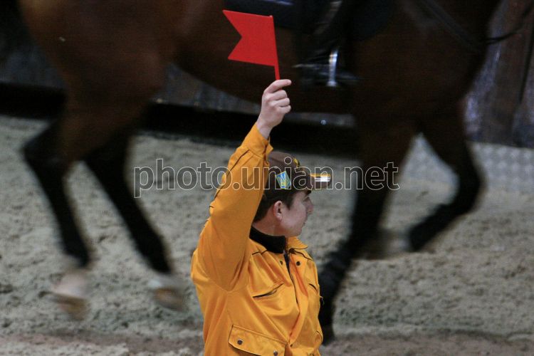 Рефери показывает красный флажок одному из участников открытия конкурного сезона Украины, Первого этапа кубка NIKO CUP 2009 в клубе верховой езды в с. Процев (Киевская обл.), в субботу, 21 февраля 2009 г. Мероприятия, посвященные открытию конкурного сезона Украины, проходили 20-21 февраля. Всего в 2009 г. пройдет 9 этапов кубка NIKO CUP 2009. Финал состоится 9-10 октября 2009 г. Фото Арсения Златовласа / УНИАН