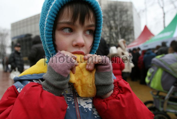 Девочка ест блин во время празднования Масленицы, в Донецке, в субботу, 28 февраля 2009 г. Масляная (Масленицы, Масленица, сырное воскресенье) – древнеславянский праздник в честь весеннего пробуждения природы. После крещения Руси Масленица празднуется в последнюю неделю перед Великим постом, за семь недель до Пасхи. Главными атрибутами праздника являются блины и народные гуляния. Христианская церковь включила Масленицу в свой календарь, однако она так и не приобрела религиозного содержания. Фото УНИАН
