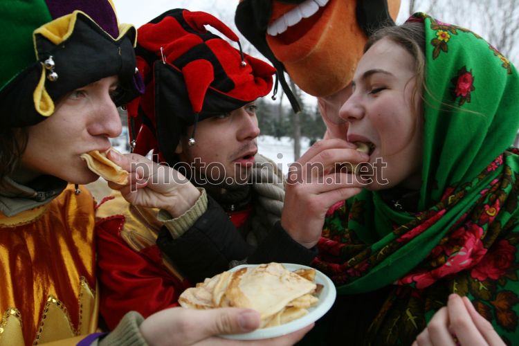 Участники празднования Масленицы в костюмах скоморохов кормят девушку блинами, в Донецке, в субботу, 28 февраля 2009 г. Масляная (Масленицы, Масленица, сырное воскресенье) – древнеславянский праздник в честь весеннего пробуждения природы. После крещения Руси Масленица празднуется в последнюю неделю перед Великим постом, за семь недель до Пасхи. Главными атрибутами праздника являются блины и народные гуляния. Христианская церковь включила Масленицу в свой календарь, однако она так и не приобрела религиозного содержания. Фото УНИАН