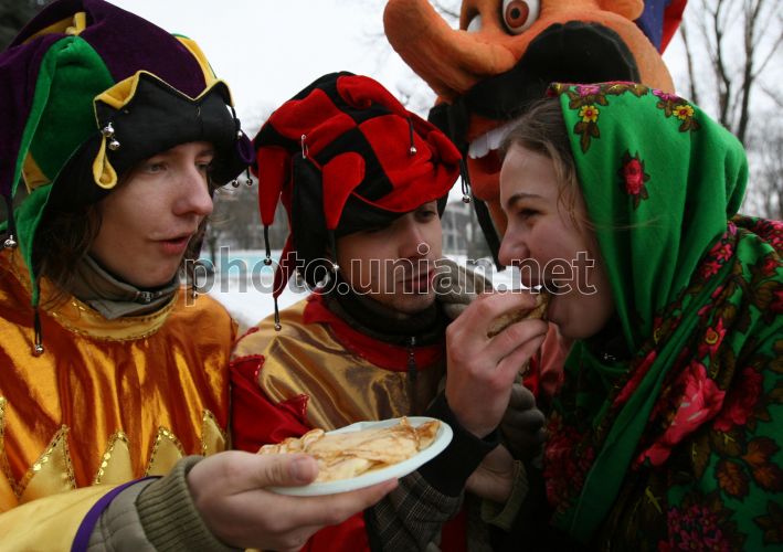 Участники празднования Масленицы в костюмах скоморохов кормят девушку блинами, в Донецке, в субботу, 28 февраля 2009 г. Масляная (Масленицы, Масленица, сырное воскресенье) – древнеславянский праздник в честь весеннего пробуждения природы. После крещения Руси Масленица празднуется в последнюю неделю перед Великим постом, за семь недель до Пасхи. Главными атрибутами праздника являются блины и народные гуляния. Христианская церковь включила Масленицу в свой календарь, однако она так и не приобрела религиозного содержания. Фото УНИАН