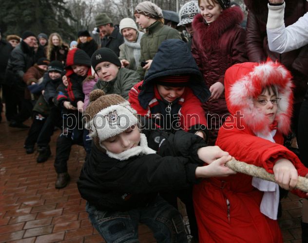 Дети соревнуются в перетягивании каната во время народных гуляний на праздновании Масленицы, в Донецке, в субботу, 28 февраля 2009 г. Масляная (Масленицы, Масленица, сырное воскресенье) – древнеславянский праздник в честь весеннего пробуждения природы. После крещения Руси Масленица празднуется в последнюю неделю перед Великим постом, за семь недель до Пасхи. Главными атрибутами праздника являются блины и народные гуляния. Христианская церковь включила Масленицу в свой календарь, однако она так и не приобрела религиозного содержания. Фото УНИАН