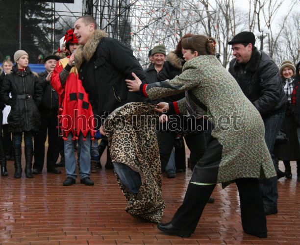 Молодой человек прыгает в мешке во время народных гуляний на праздновании Масленицы, в Донецке, в субботу, 28 февраля 2009 г. Масляная (Масленицы, Масленица, сырное воскресенье) – древнеславянский праздник в честь весеннего пробуждения природы. После крещения Руси Масленица празднуется в последнюю неделю перед Великим постом, за семь недель до Пасхи. Главными атрибутами праздника являются блины и народные гуляния. Христианская церковь включила Масленицу в свой календарь, однако она так и не приобрела религиозного содержания. Фото УНИАН