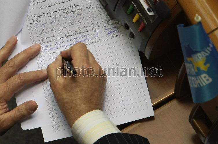 Народный депутат от Партии регионов пишет список депутатов своей партии во время заседания Верховной Рады Украины, в Киеве, в четверг, 19 марта 2009 г. Верховная Рада Украины приняла Закон «О внесении изменений в Кодекс Украины об административных правонарушениях относительно усиления ответственности за нарушение правил пребывания в Украине». За такое решение проголосовали 233 из 440 народных депутатов, зарегистрированных в сессионном зале. Законом внесены изменения в статьи 204-206-1 Кодекса Украины об административных правонарушениях (КУоАП). Так, за нарушение порядка трудоустройства, принятия на учебу, предоставление жилья, регистрации, прописки или выписки иностранцев и лиц без гражданства и оформления для них документов КУоАП предусмотрена санкция в виде штрафа от ста до двухсот необлагаемых минимумов доходов граждан (что будет составлять от 1700 до 3400 грн.). Фото Сергея Светлицкого / УНИАН