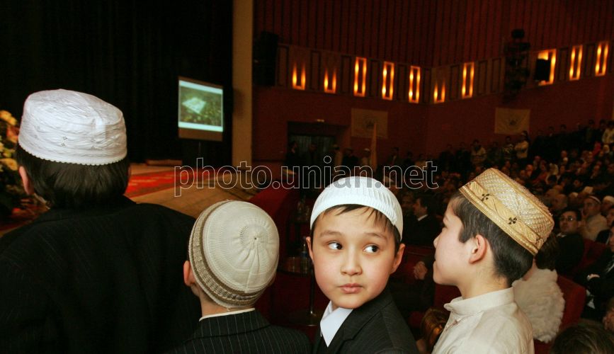Дети-мусульмане во время торжественных мероприятий, посвященный рождению Пророка Мухаммада, организованных Духовным управлением мусульман Украины, в Киеве, в четверг, 19 марта 2009 г. У мусульман всего мира месяц март отмечается как месяц Мавлюд – рождение Пророка. В течение месяца мусульмане проводят чтения, конференции, круглые столы, где рассказывается о жизни и деятельности Пророка Мухаммада. Дня рождения Пророка Мухаммада считается одним из главных мусульманских праздников. Мероприятия, посвященные Мавлюду, проходят по всей территории Украины. В Коране подчеркивается, что Мухаммад (да благословит его Аллах и приветствует) - последний посланник Бога. Фото Владимира Гонтара / УНИАН