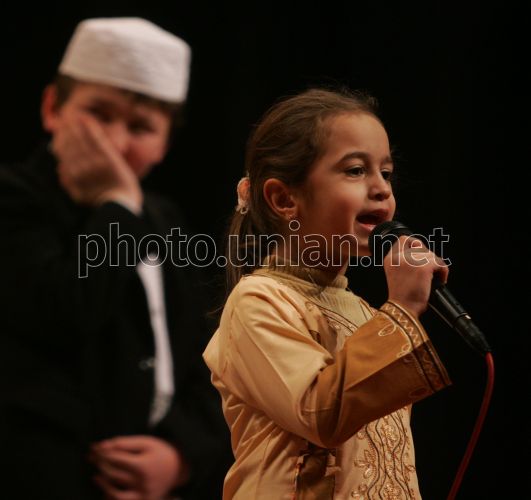 Дети-мусульмане выступают во время торжественных мероприятий, посвященный рождению Пророка Мухаммада, организованных Духовным управлением мусульман Украины, в Киеве, в четверг, 19 марта 2009 г. У мусульман всего мира месяц март отмечается как месяц Мавлюд – рождение Пророка. В течение месяца мусульмане проводят чтения, конференции, круглые столы, где рассказывается о жизни и деятельности Пророка Мухаммада. Дня рождения Пророка Мухаммада считается одним из главных мусульманских праздников. Мероприятия, посвященные Мавлюду, проходят по всей территории Украины. В Коране подчеркивается, что Мухаммад (да благословит его Аллах и приветствует) - последний посланник Бога. Фото Владимира Гонтара / УНИАН
