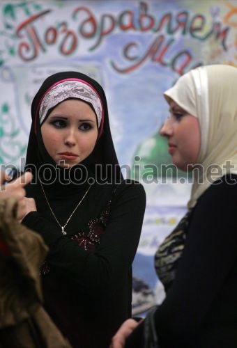 Участницы торжественных мероприятий, посвященный рождению Пророка Мухаммада, организованных Духовным управлением мусульман Украины, в Киеве, в четверг, 19 марта 2009 г. У мусульман всего мира месяц март отмечается как месяц Мавлюд – рождение Пророка. В течение месяца мусульмане проводят чтения, конференции, круглые столы, где рассказывается о жизни и деятельности Пророка Мухаммада. Дня рождения Пророка Мухаммада считается одним из главных мусульманских праздников. Мероприятия, посвященные Мавлюду, проходят по всей территории Украины. В Коране подчеркивается, что Мухаммад (да благословит его Аллах и приветствует) - последний посланник Бога. Фото Владимира Гонтара / УНИАН