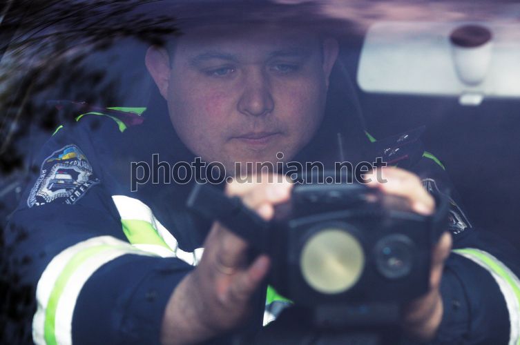 Сотрудник ГАИ работает с видеозаписывающим измерителем скорости "Визир", сидя в служебном автомобиле, на одной из центральных улиц в Киеве, в среду, 25 марта 2009 г. Фото Владимира Гонтара / УНИАН