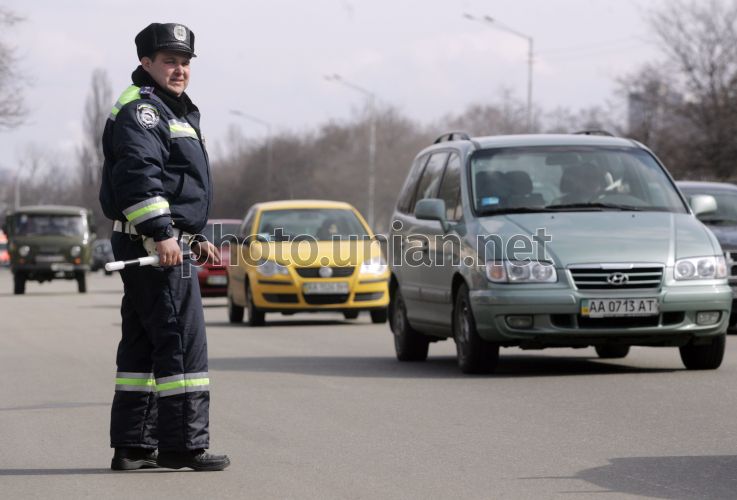 Сотрудник ГАИ во время работы на одной из центральных улиц, в Киеве, в среду, 25 марта 2009 г. Фото Владимира Гонтара / УНИАН