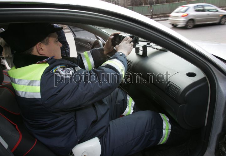 Сотрудник ГАИ работает с видеозаписывающим измерителем скорости ”Визир”, сидя в служебном автомобиле, на одной из центральных улиц, в Киеве, в среду, 25 марта 2009 г. Фото Владимира Гонтара / УНИАН