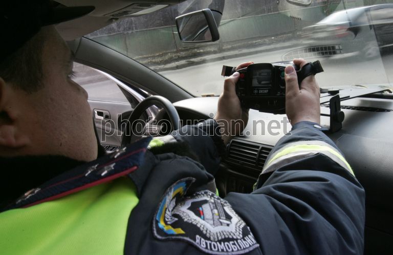 Сотрудник ГАИ работает с видеозаписывающим измерителем скорости ”Визир”, сидя в служебном автомобиле, на одной из центральных улиц, в Киеве, в среду, 25 марта 2009 г. Фото Владимира Гонтара / УНИАН