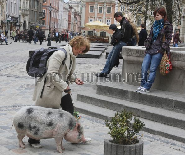 Женщина ведет свинью по одной из улиц во Львове, в пятницу, 17 апреля 2009 г. Фото УНИАН