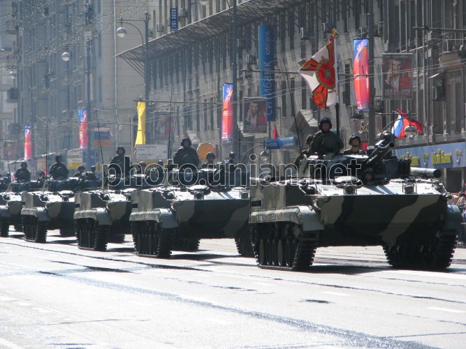 Колонна танков во время парада, посвященного 64-й годовщине победы в Великой Отечественной войне, в Москве (Россия), в субботу, 9 мая 2009 г. Парад начался с выноса на Красную площадь государственного флага РФ, Знамени Победы и знамени Вооруженных сил РФ. В парадном строю находились почти 9 тыс. военнослужащих. В составе механизированной парадной колонны по Красной площади проследовали 103 единицы техники. Заключительной частью парада стал пролет парадного строя авиации ВВС России. Всего в пролете участвовали 69 самолетов и вертолетов. Фото Романа Цимбалюка / УНИАН