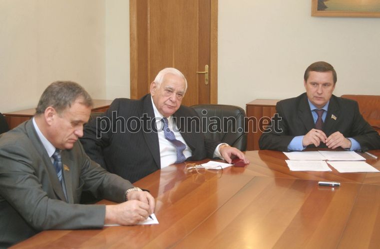 Слева направо: члены временной следственной комиссии (ТСК) Верховной Рады Украины по расследованию обстоятельств организации "Кассетного скандала" Ярослав Сухой, Ефим Звягильский и Виктор Драчевский (председатель ТСК) во время работы ТСК в Киеве в среду, 21 декабря в 2005 г.