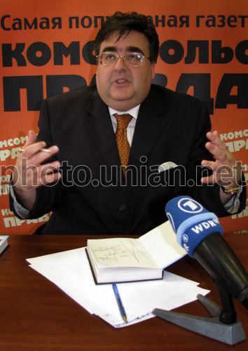 Российский политик, депутат Госдумы РФ 1993-2008 годов Алексей Митрофанов во время презентации своей книги «Юлия», посвященной премьер-министру Украины, лидеру БЮТ Юлии Тимошенко, в Москве (Россия), в среду, 17 июня 2009 г. На пресс-конференции, посвященной презентации издания, Алексей Митрофанов подчеркнул, что в данной книге не пытается скомпрометировать или «пропиарить» Юлию Тимошенко, а хочет рассказать о ее характере. Он отметил, что это художественное произведение, в котором нет фамилии героини, не указываются ее должности, но большинство фактов не вымышлены. По словам Алексея Митрофанова , его интерес к Юлии Тимошенко вызван тем, что она наиболее яркая личность мировой и украинской политики. «Тот, кто хочет знать характер Юлии Тимошенко, – он прочитает, чтобы знать, как этот человек принимает решения и как действует», - сказал Алексей Митрофанов, подчеркнув, что самое главное в его произведении - описание характера, стиля и методов работы Юлии Тимошенко. Фото Романа Цимбалюка / УНИАН