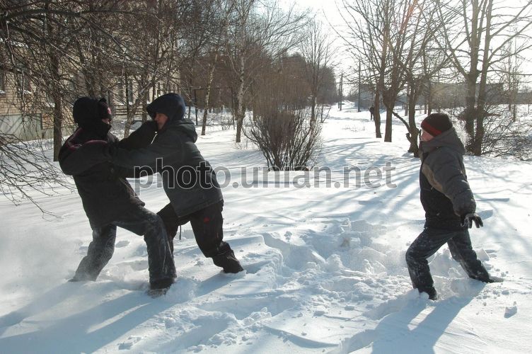 COMM Дети играют в снежки в Запорожье в суботу, 21 января 2006 г. У школьников отменены занятия до 25 января из-за сильных морозов. В Запорожье в связи с непогодой: обильными снегопадами, сопровождающимися шквальным ветром, введено чрезвычайное положение. Снег непрерывно идет уже вторые сутки, температура в городе составляет -21 градус по Цельсию и синоптики прогнозируют дальнейшее ухудшение погодных условий. До конца недели в Украине сохранится холодная погода.
