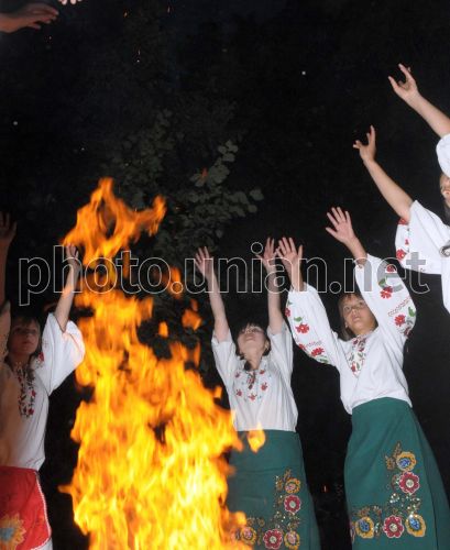 Девушки в национальных костюмах водят хоровод вокруг костра во время праздника Ивана Купала, в Близнецовском районе Харьковской обл, во вторник, 7 Июля 2009 г. Ивана Купала - народный языческий праздник, который по старому стилю отмечают в ночь с 21 на 22 июня (с 6 на 7 июля по новому стилю). Это день летнего солнцеворота (солнцестояния), который совпадает с Рождеством Ивана Крестителя. Считается, что именно этой ночью объединяются три стихии - Земля, Огонь и Вода. Имя празднику дал Купало – языческий бог земных плодов. Главные атрибуты праздника - это Купало и Марена. К празднику молодежь заранее старательно готовилась: делали чучела, готовили деревца (называли их ”Мареной” или ”Купалом”), собирали хворост, готовили шары соломы для костра. По традиции, Купало и Марена - это две украшенные цветами ветки, похожие на человеческие фигуры. Вокруг чучел молодежь водит хороводы и поет ритуальные купальские песни. Девушки плетут венки из полевых цветов и перед закатом солнца собираются на выгонах у рек. Вечером или уже поздней ночью они пускают на воду венки с прикрепленными зажженными свечами. Фото Владимир Андреев / УНИАН