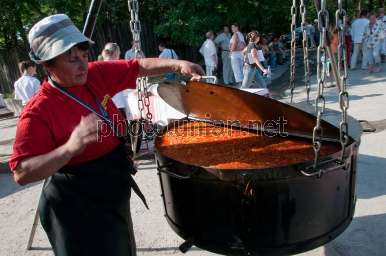Повар варит борщ в 300-литровом казане в Национальном заповеднике Хортица, в Запорожье, во вторник, 7 июля 2009 г. В этот день на Хортице во время празднования дня Ивана Купала было сварено рекордное для Украины количество национального блюда – 600 литров борща. Настоящий украинский борщ на острове Хортица варили в двух казанах по 300 литров, отведать его мог каждый желающий. На его приготовление ушло 60 литров сметаны, 45 кг моркови, 120 кг картошки, 96 кг буряка, 25 штук кур. Это событие было зарегистрировано представителями книги рекордов Украины. Фото Александра Прилепы / УНИАН
