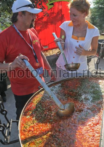 Повар варит борщ в 300-литровом казане в Национальном заповеднике Хортица, в Запорожье, во вторник, 7 июля 2009 г. В этот день на Хортице во время празднования дня Ивана Купала было сварено рекордное для Украины количество национального блюда – 600 литров борща. Настоящий украинский борщ на острове Хортица варили в двух казанах по 300 литров, отведать его мог каждый желающий. На его приготовление ушло 60 литров сметаны, 45 кг моркови, 120 кг картошки, 96 кг буряка, 25 штук кур. Это событие было зарегистрировано представителями книги рекордов Украины. Фото Александра Прилепы / УНИАН
