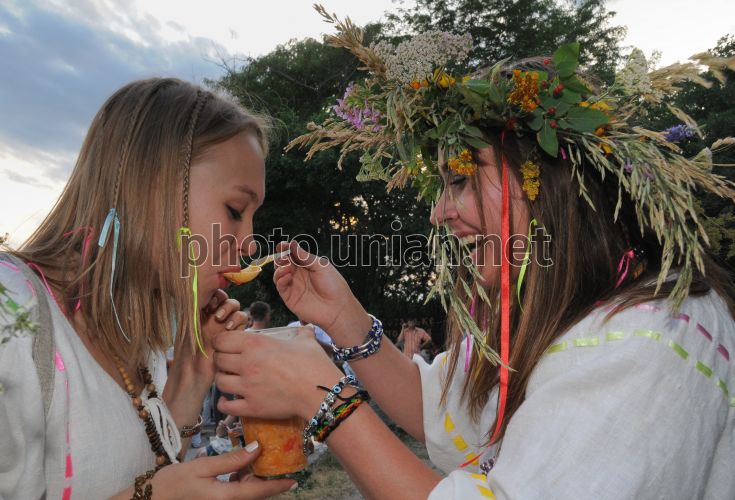 Девушка в венке кормит борщом свою подругу, в Национальном заповеднике Хортица, в Запорожье, во вторник, 7 июля 2009 г. В этот день на Хортице во время празднования дня Ивана Купала было сварено рекордное для Украины количество национального блюда – 600 литров борща. Настоящий украинский борщ на острове Хортица варили в двух казанах по 300 литров, отведать его мог каждый желающий. На его приготовление ушло 60 литров сметаны, 45 кг моркови, 120 кг картошки, 96 кг буряка, 25 штук кур. Это событие было зарегистрировано представителями книги рекордов Украины. Фото Александра Прилепы / УНИАН