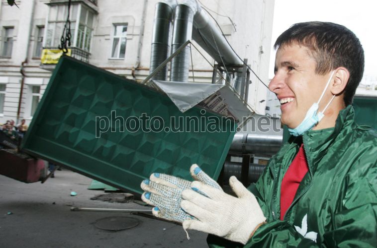 Молодой человек во время демонтажа бетонного забора на стройплощадке по ул. Гончара, в Киеве, во вторник, 14 июля 2009 г. В этот день возле стройплощадки по ул. Гончара 17-23, где планируется возвести торгово-развлекательный комплекс, собрались жители микрорайона, прилегающего к строительству, также присутствовал народный депутат от НУНС Кирилл Куликов. Инициативная группа жителей демонтировала строительный забор. По нескольким решениям судов эта стройка признана незаконной, но она не прекратила работу, поэтому киевляне решили сами снести забор и тем самым приостановить незаконную стройку. Фото Владимира Гонтара / УНИАН