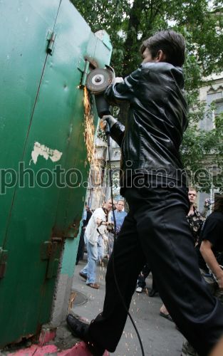 Молодой человек срезает с помощью промышленной электропилы дверные петли на заборе на стройплощадке по ул. Гончара, в Киеве, во вторник, 14 июля 2009 г. В этот день возле стройплощадки по ул. Гончара 17-23, где планируется возвести торгово-развлекательный комплекс, собрались жители микрорайона, прилегающего к строительству, также присутствовал народный депутат от НУНС Кирилл Куликов. Инициативная группа жителей демонтировала строительный забор. По нескольким решениям судов эта стройка признана незаконной, но она не прекратила работу, поэтому киевляне решили сами снести забор и тем самым приостановить незаконную стройку. Фото Владимира Гонтара / УНИАН