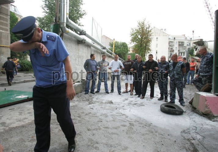 Сотрудник милиции, надышавшийся слезоточивым газом, который применила охрана стройплощадки по ул. Гончара, в Киеве, во вторник, 14 июля 2009 г. В этот день возле стройплощадки по ул. Гончара 17-23, где планируется возвести торгово-развлекательный комплекс, собрались жители микрорайона, прилегающего к строительству, также присутствовал народный депутат от НУНС Кирилл Куликов. Инициативная группа жителей демонтировала строительный забор. По нескольким решениям судов эта стройка признана незаконной, но она не прекратила работу, поэтому киевляне решили сами снести забор и тем самым приостановить незаконную стройку. Фото Владимира Гонтара / УНИАН